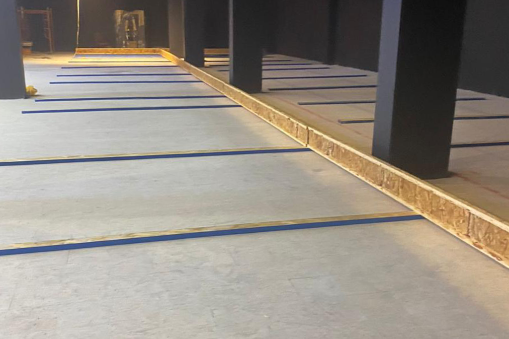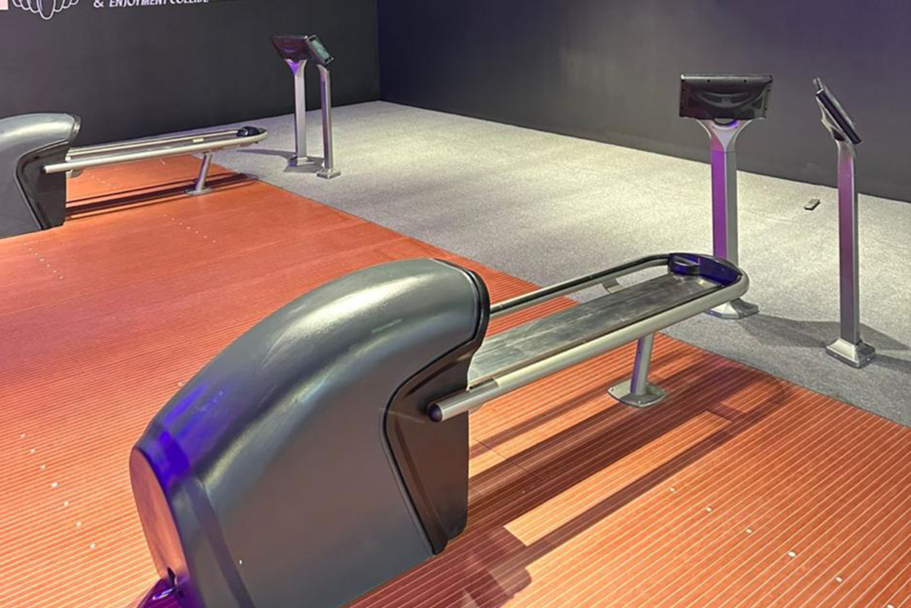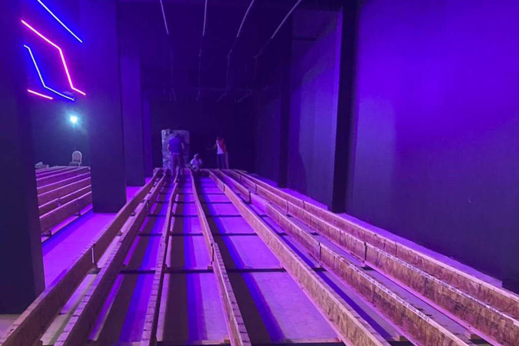 Modern bowling alley with colorful LED lighting and digital score screens.